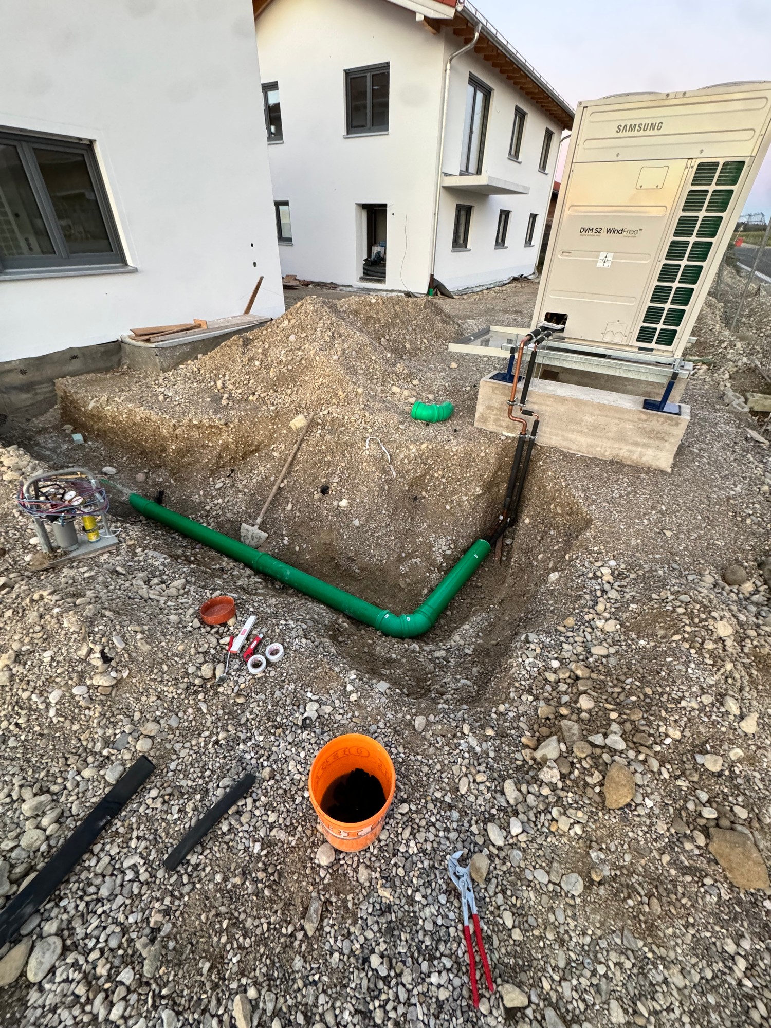 Instalace tepelných čerpadel Samsung DVM S2 s napojením na podlahové vytápění a regulační systémy. Kompletní návrh, realizace včetně zemních prací a MaR.